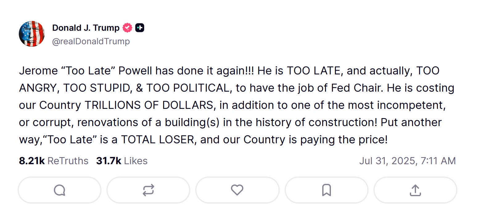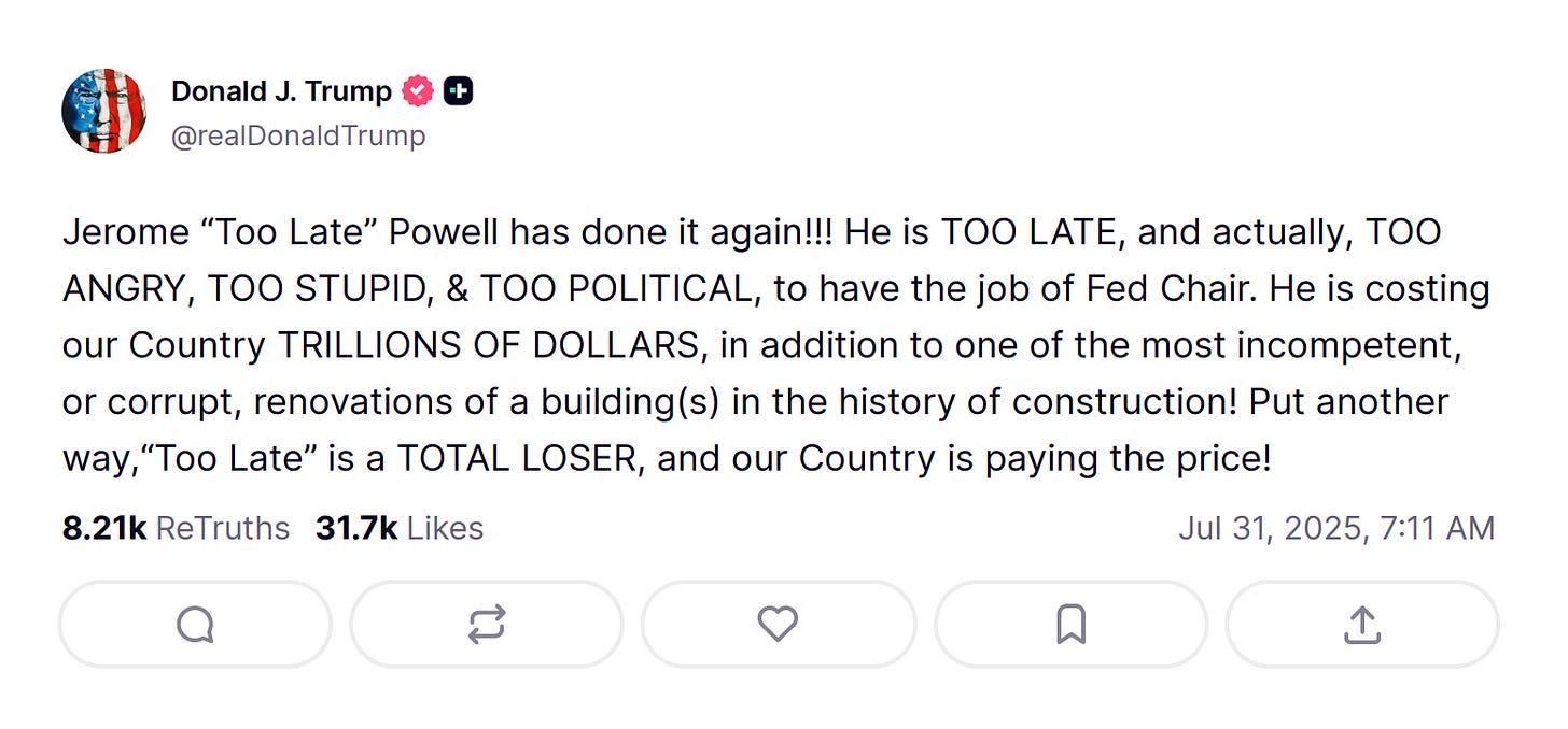 Trump’s chief instigator is Bill Pulte, director of the Federal Housing Finance Agency and the chairman of Fannie Mae and Freddie Mac, who spends his days spelunking through confidential financial documents looking for dirt on Trump’s enemies. He’s the one who came up with the allegation that Federal Reserve Board Member Lisa Cook had lied on a mortgage application, justifying her termination “for cause” and freeing up Trump to install someone more pliant. With Powell, Pulte seems to have settled on cost overruns in the renovation of the Federal Reserve buildings as a convenient excuse.
