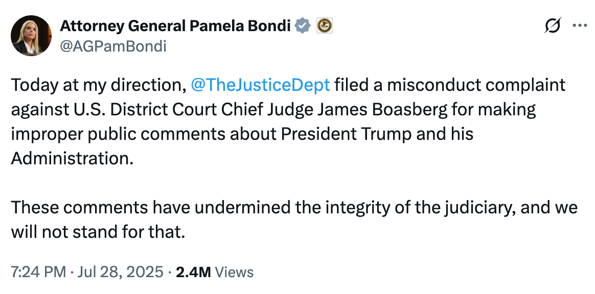 On Monday, July 28, Attorney General Bondi’s Chief of Staff Chad Mizelle, hand-delivered an ethics complaint to the US Court of Appeals for the DC Circuit. In typically indignant terms, it alleged a gross violation of judicial ethics by Chief Judge James Boasberg of the US District Court for the District of Columbia.